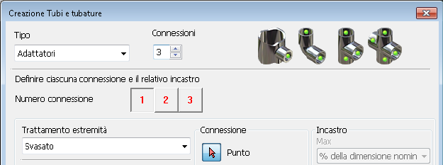 Durante la pubblicazione del contenuto di Tubi e tubature nella finestra di dialogo Creazione Tubi e tubature, l'impostazione del trattamento di estremità utilizzato più di recente per le connessioni viene composto automaticamente mentre si aggiungono le connessioni.
