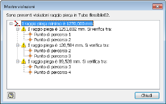 La finestra di messaggio visualizzata quando si verifica un problema nel raggio piega è stata sostituita dalla nuova finestra di dialogo Mostra violazioni. La nuova finestra di dialogo Mostra violazioni presenta una vista struttura dei segmenti di spline ove sono presenti violazioni del raggio piega. Selezionando un nodo nella finestra di dialogo, il segmento corrispondente viene evidenziato nella finestra grafica.