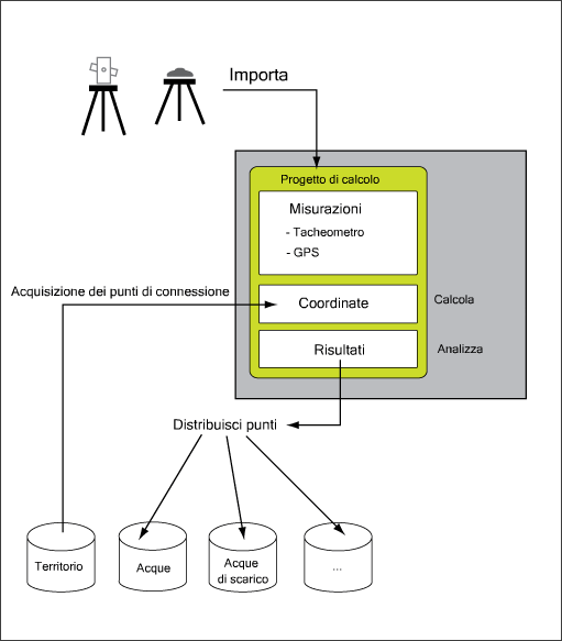 Il modulo Rilievo di AutoCAD Map consente di importare ed elaborare le misurazioni fatte sul campo nelle Carte modello di settore e nel modello di settore Enterprise . Fornisce inoltre strumenti per l'importazione dei dati di rilievo terrestre e GPS. I dati rilevati sul campo vengono importati e le coordinate vengono calcolate in uno schema del database dei rilievi. In seguito, sarà possibile utilizzare le quantità statistiche per analizzare i risultati e distribuire le coordinate nei relativi modelli di settore, ad esempio Acque o Acque di scarico.