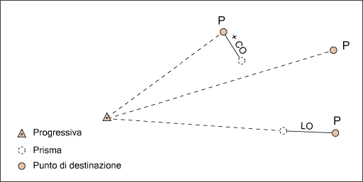 Per le misurazioni del tacheometro, l'offset della lunghezza e l'offset incrociato vengono utilizzati se non è possibile misurare direttamente il punto di riferimento.