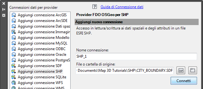 - Nella finestra Connessione dati, nell'elenco Connessioni dati per provider a sinistra, selezionare Aggiungi connessione SHP.