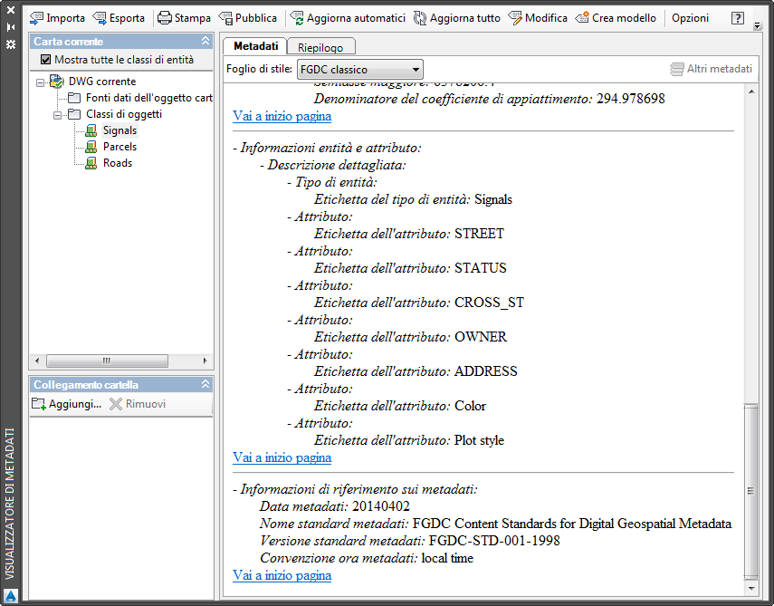 Se una Carta contiene oggetti classificati, i relativi metadati vengono generati e visualizzati automaticamente alla prima apertura del Visualizzatore di metadati.
