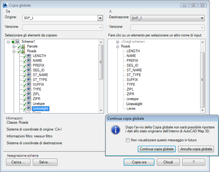 Copiare il layer Roads dal formato SDF nel formato SHP utilizzando la funzionalità Copia globale.