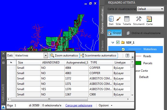 Nella Tabella dati vengono visualizzate le proprietà generali e i dati oggetto specifici del layer Waterlines.
