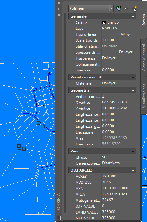Proprietà. Le polilinee rosa rappresentano le particelle e includono dati oggetto relativi ad indirizzo, area, valore e così via.