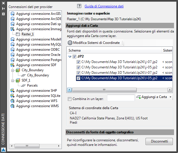 Connetti a dati. La cartella contiene più file JPEG 2000, ciascuno dei quali copre una piccola area della città di Redding. Gli elementi non vengono selezionati automaticamente in quanto è possibile che l'utente non desideri utilizzarli tutti.
