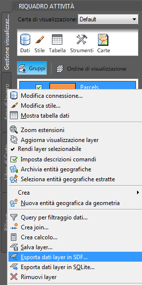 - In Gestione visualizzazioni, fare clic con il pulsante destro del mouse sul layer Parcels e scegliere Esporta dati layer in SDF.