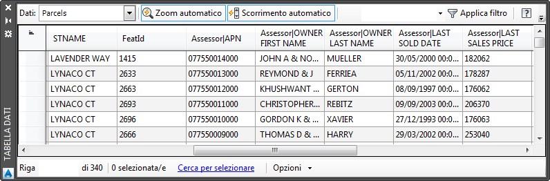 Nel layer Parcels sono ora visualizzati i dati uniti. Tali dati, tuttavia, sono visualizzati in grigio nella Tabella dati. Il testo in grigio indica che i dati uniti non fanno parte dell'archivio dati originale e non possono essere modificati né utilizzati in una proprietà calcolata.