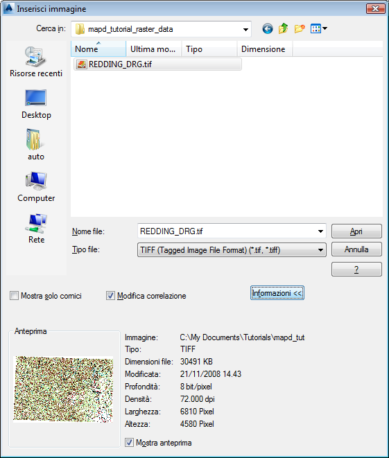 La Fonte di correlazione è un File World. Il file è denominato REDDING_DRG.tfw ed è memorizzato nella posizione in cui sono stati copiati i file di esempio dell'esercitazione.