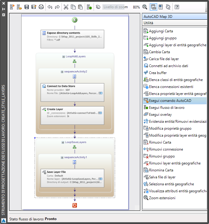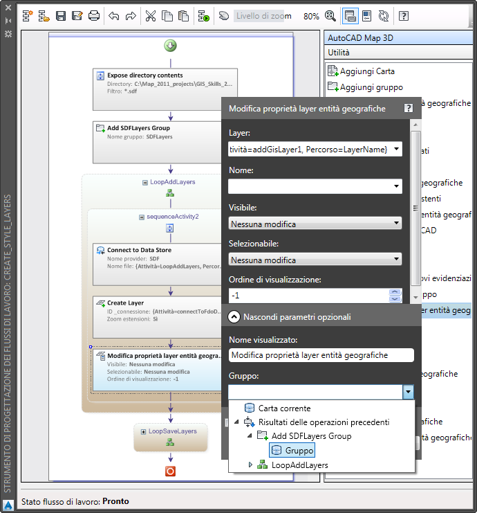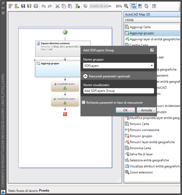 In questa lezione verrà modificato il flusso di lavoro predefinito che crea layer di Gestione visualizzazioni da una cartella contenente file SDF e li salva in file .layer. Verrà creato un gruppo in cui inserire i layer che verranno quindi spostati nel nuovo gruppo.