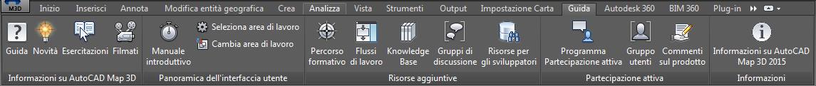 - Guida in linea: consente la ricerca e la consultazione di concetti e procedure relativi a tutti gli aspetti di AutoCAD Map 3D.