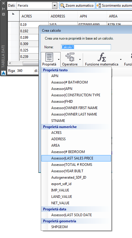 I dati dei proprietari sono stati uniti al layer Parcels e il risultato è stato salvato in un nuovo archivio dati. È possibile utilizzare le informazioni combinate per creare una proprietà calcolata. Tale proprietà è il risultato di un'espressione, in questo caso l'ultimo prezzo di vendita diviso per l'area.