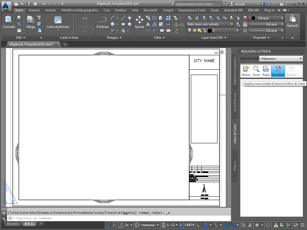 Dopo aver definito il modello del libro di Carte e aver salvato la Carta, è possibile pubblicare il libro di Carte su un plotter oppure in un file DWF.