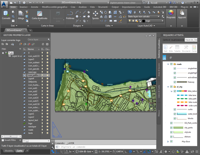 Questa Carta contiene sia i layer di AutoCAD (a sinistra) sia i layer di Gestione visualizzazioni (a destra).