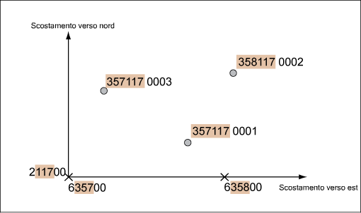 Il prefisso ripetitivo viene generato dal valore 100 <unità di lunghezza> delle coordinate: 3 cifre fanno riferimento allo scostamento verso est e altre 3 allo scostamento verso nord, pertanto il prefisso è sempre un valore a 6 cifre.