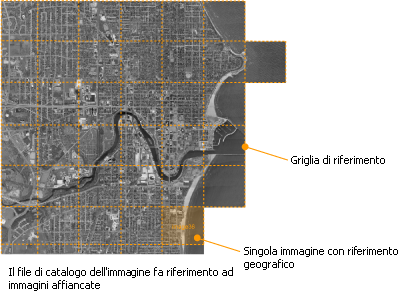 I file raster (o di immagine) sono dati basati su pixel, ad esempio fotografie digitali, che è possibile utilizzare come dati oggetto e dati di disegno. È possibile, ad esempio, visualizzare una fotografia aerea di una città sotto un layer di strade. I file raster vengono catalogati per ottimizzare le prestazioni. La procedura di creazione di un catalogo raster rientra nella procedura di caricamento.