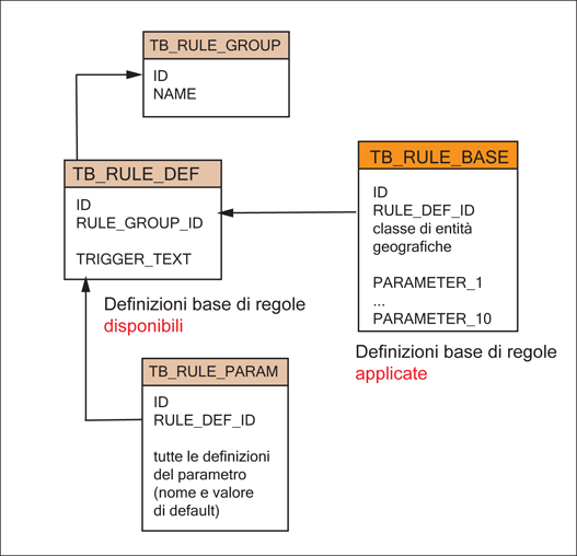 Nelle tabelle di sistema TB_RULE* vengono memorizzate le regole delle entità geografiche.