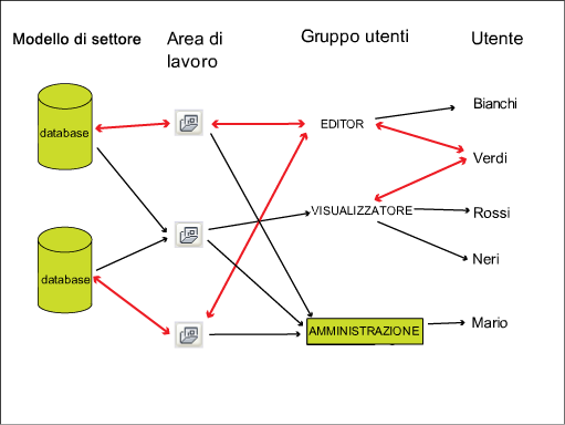 Dopo l'installazione è disponibile un utente di default, denominato Administrator, membro del gruppo di utenti ADMIN. Per i modelli di settore Enterprise è possibile creare ulteriori gruppi di utenti con diritti di accesso diversi, ad esempio VIEWER ed EDITOR. È consigliabile creare un utente per ogni persona che utilizza il modello di settore Enterprise, ad esempio Mr. Smith o Ms. Miller.