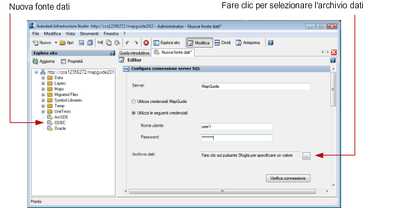 - Se il database è stato impostato per il riconoscimento delle credenziali di Map Server, selezionare Usa credenziali di Map Server.