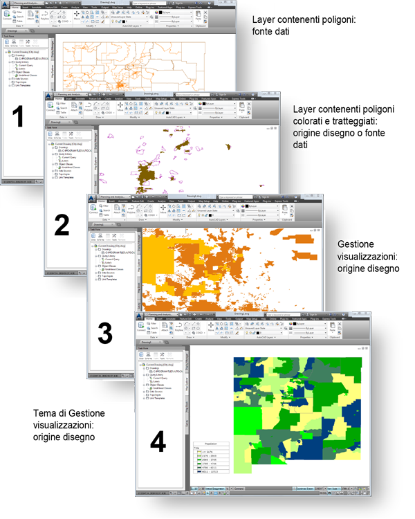 Map. Il layer contenente poligoni senza stile (schermata 1 in alto) viene convertito in una fonte dati, poiché contiene geometria semplice. Gli stili e i temi di Gestione visualizzazioni (3 e 4) presentano già uno stile e vengono quindi convertiti in fonti dati della Carta. Esiste anche un layer poligono che include uno stile (2). In questo caso, è possibile scegliere di convertire il layer in una fonte dati dell'oggetto cartografico (con conseguente perdita dello stile) o in una fonte dati della Carta (mantenendo lo stile).
