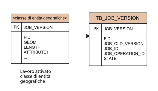 Nella tabella TB_JOB_VERSION è memorizzata la cronologia completa di tutte le entità geografiche. La tabella delle entità è dotata di un attributo relativo ai job: JOB_VERSION. La tabella TB_JOB_VERSION controlla anche la visibilità delle entità geografiche.