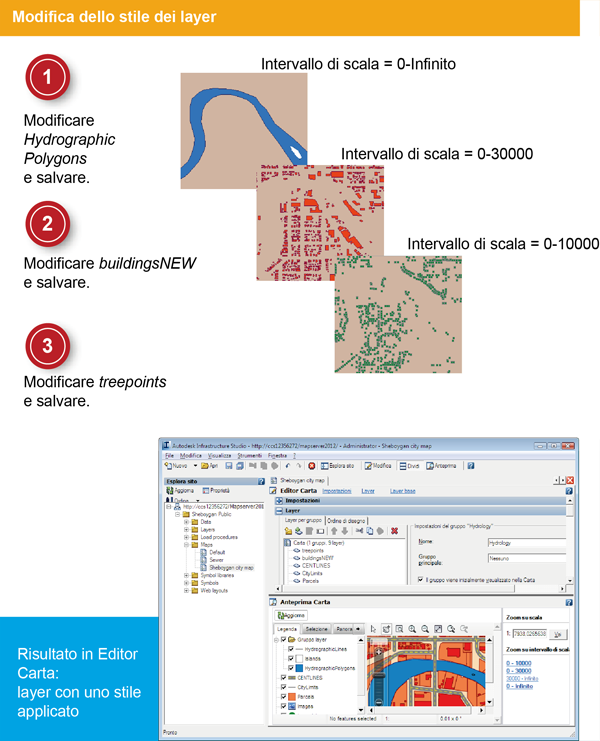 In questo esercizio vengono definiti gli stili per alcuni layer non ancora modificati per far sì che i layer nella Carta vengano visualizzati a colori e con le scale appropriate.