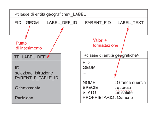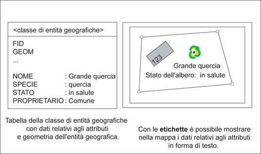 Modello di dati: relazioni fra la tabella di entità geografiche e la classe di entità geografiche etichetta. Lo stesso attributo (nome della struttura = Grande quercia) viene salvato con l'entità geografica. Per visualizzare il valore in formato testo nella grafica, generare le etichette.