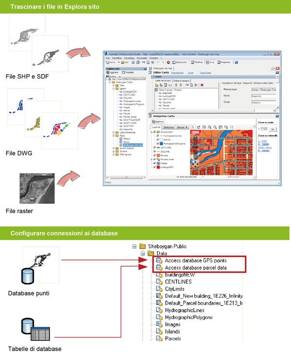 Affinché sia possibile creare Carte in Infrastructure Map Server, è necessario rendere disponibili i dati di origine. Sono disponibili tre metodi per rendere disponibili i dati di origine: