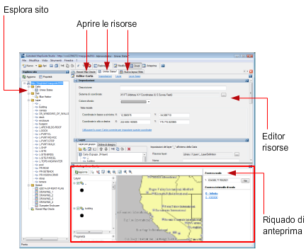 Per utilizzare Infrastructure Studio, è necessario connettersi al sito in cui sono memorizzate le risorse. Tali risorse sono visualizzate in Esplora sito. Fare doppio clic su una risorsa per visualizzarne le proprietà nell'editor, da cui è possibile apportare le modifiche desiderate. Le funzionalità dell'editor variano a seconda del tipo di risorsa da modificare.