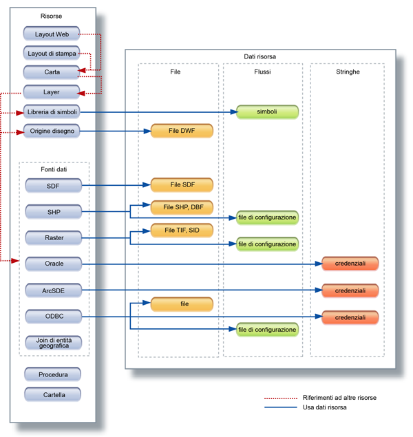 Altre risorse, come i layout di stampa, sono autosufficienti e non fanno riferimento ad altre risorse o file. Alcune risorse utilizzano dati di risorse associate. Ad esempio, una fonte dati ArcSDE utilizza un file che contiene le credenziali del database. Le risorse possono essere memorizzate come file, flussi o stringhe.