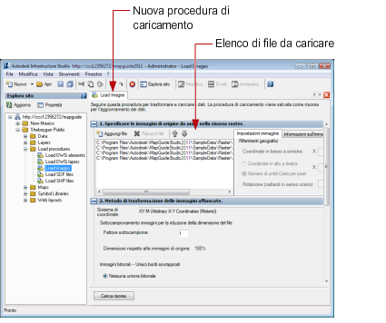 A destra di Esplora sito viene visualizzata una nuova procedura di caricamento. In Autodesk Infrastructure Studio viene preparato un file di catalogo per le immagini, a cui viene assegnato il nome del primo file di immagine.