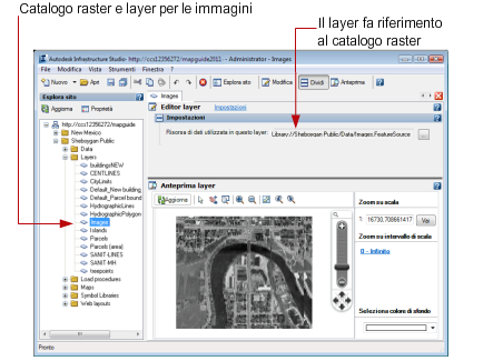 In Autodesk Infrastructure Studio le immagini vengono convertite in un'unica risorsa di catalogo raster e viene creato un layer di riferimento. In Esplora sito vengono visualizzate le icone del layer e del catalogo raster.
