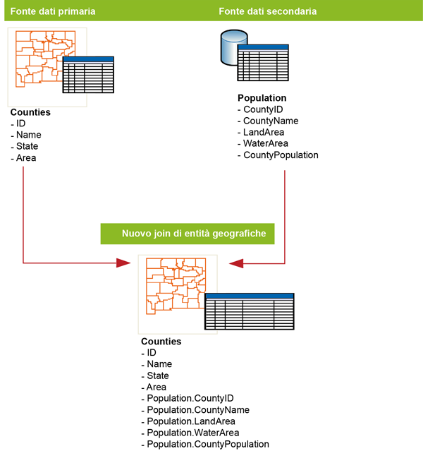 Dopo aver effettuato la connessione ai dati o dopo averli caricati, è possibile creare relazioni tra due fonti dati. Tali relazioni sono definite join di entità geografiche. Un join viene salvato come una nuova risorsa nel catalogo. Quando si uniscono le fonti dati, viene creata una risorsa join di entità geografiche, simile ad un join relazionale in un database, ad eccezione del fatto che per creare una nuova risorsa di entità geografiche se ne "estende" una esistente.