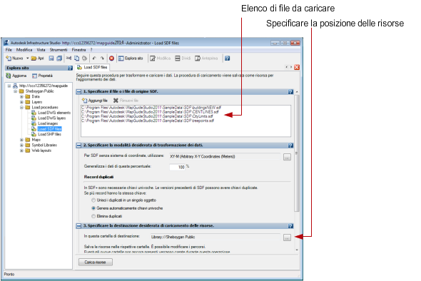 In questa procedura si presume che si intenda caricare uno o più file SDF 2 o SDF 3. Per caricare un file SDF, trascinare uno o più file di origine in Esplora sito. In Autodesk Infrastructure Studio è possibile convertire i file SDF 2 nel formato SDF 3 e creare automaticamente un nuovo layer per ogni file, nonché una nuova fonte dati dell'oggetto cartografico.