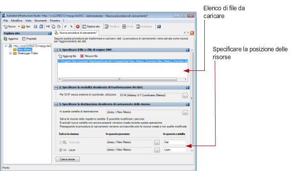 In questa procedura si presume che si intenda caricare uno o più file DWF. Per caricare un file DWF, trascinare il file di origine in Esplora sito. In Autodesk Infrastructure Studio è possibile creare automaticamente un nuovo layer e una nuova fonte dati dell'oggetto cartografico.