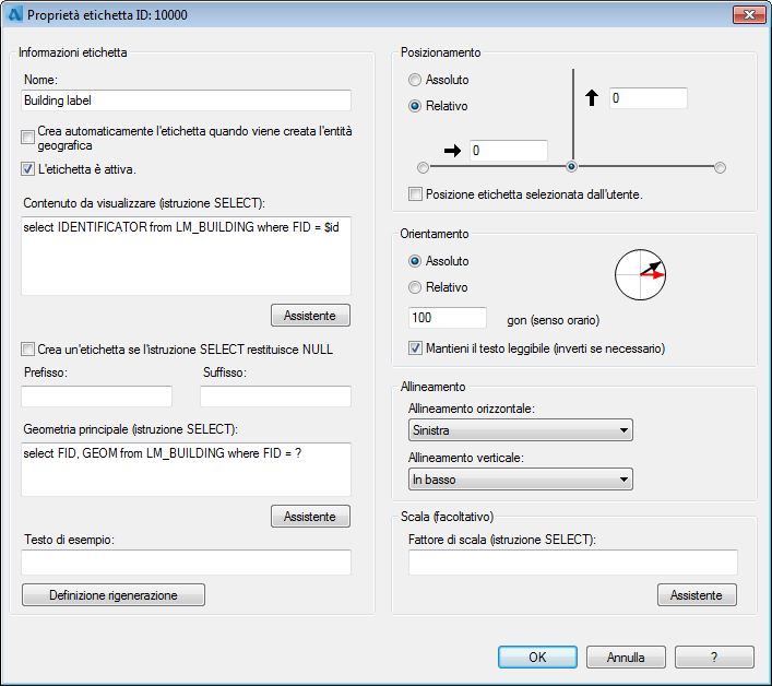 Le proprietà dell'etichetta definiscono come viene selezionato il testo nel database e il posizionamento dell'etichetta.