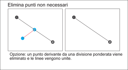 P1: DeleteSoftSplitters. Il valore di default è NO. Specifica se eliminare i punti risultanti da una divisione ponderata e unire le linee, analogamente a quanto avviene con la regola di entità geografica AutoExtractSoftSplit. P2: AskUser. Il valore di default è YES. Specifica se viene richiesto all'utente di eliminare i punti superflui. Se il parametro è NO, vengono eliminati senza intervento dell'utente. |