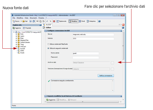 - Se il database è stato impostato per il riconoscimento delle credenziali di Map Server, selezionare Usa credenziali di Map Server.