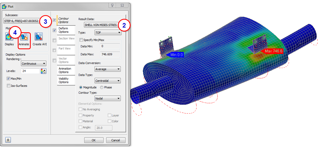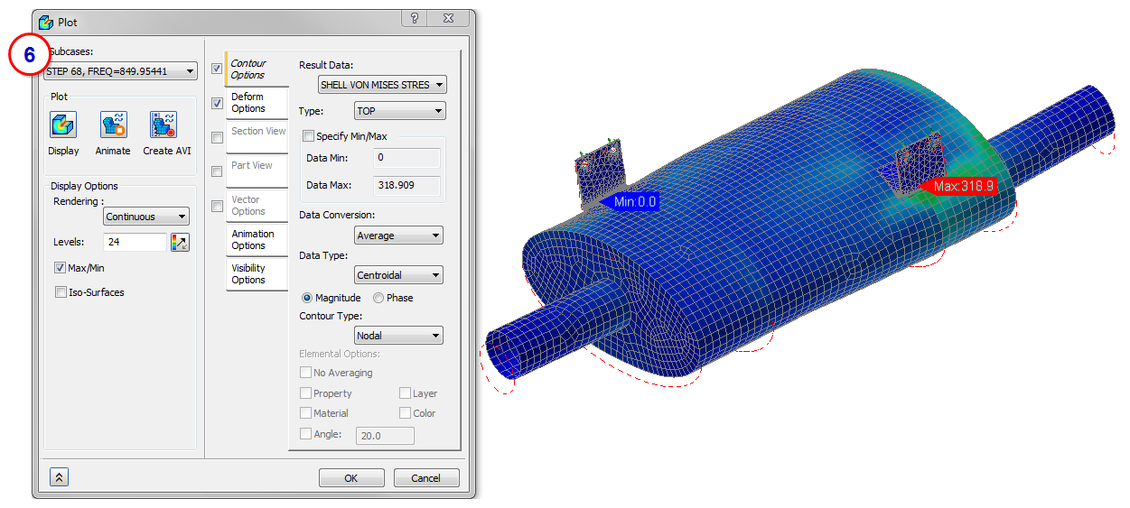 In this exercise, we shook the muffler with the road load inputs to see how much stress is expected since we still had natural frequencies in the operating range of the curve. From the resultant stress levels, we can determine if a fatigue study is required.