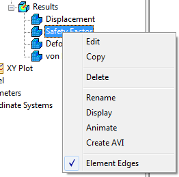 To animate the displacement, right-click on the result quantity in the Model Tree, and select Animate. To modify the animation settings, right-click on the result quantity, and select Edit.