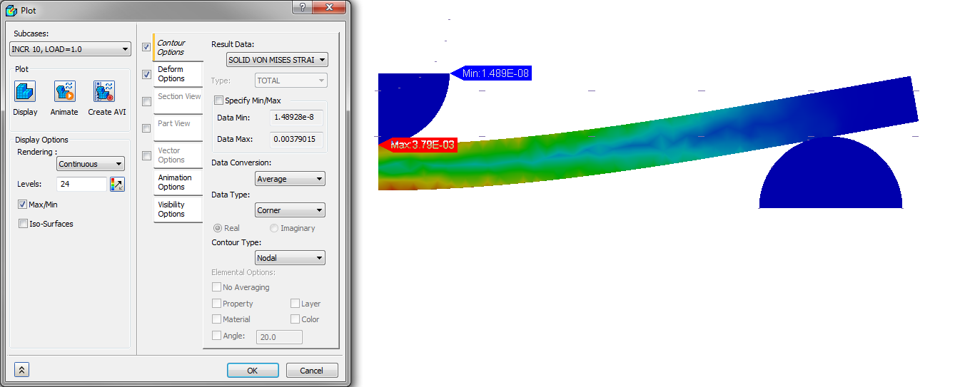 - Select Solid Von Mises Strain from the Result Data menu. Click Display if the results are not showing.