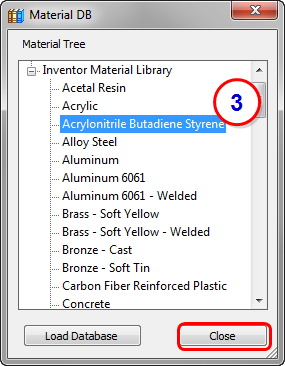- On the Material dialog, click Select Material. Expand the Inventor Material Library, and select Acrylonitrile Butadiene Styrene. Click Close.