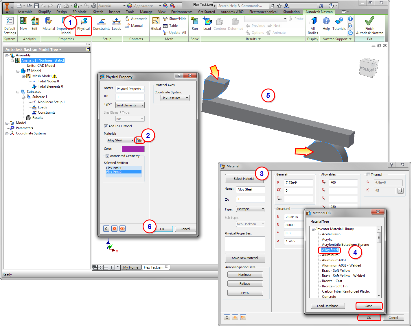 - On the Material dialog, click Select Material. Expand the Inventor Material Library, and select Alloy Steel. Click Close and OK.