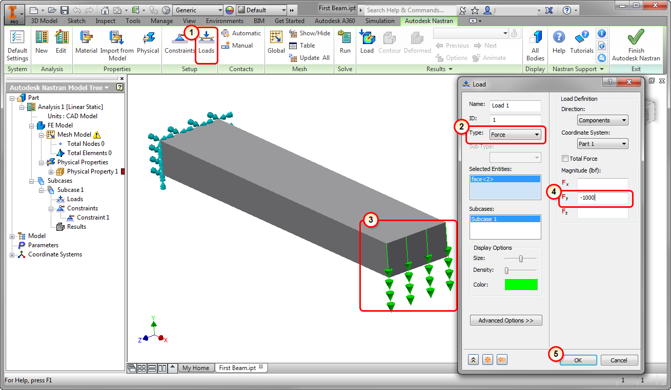 In this exercise, we will simulate a simple cantilevered beam with a fixed end and a load applied to the other end. Here is the basic process: