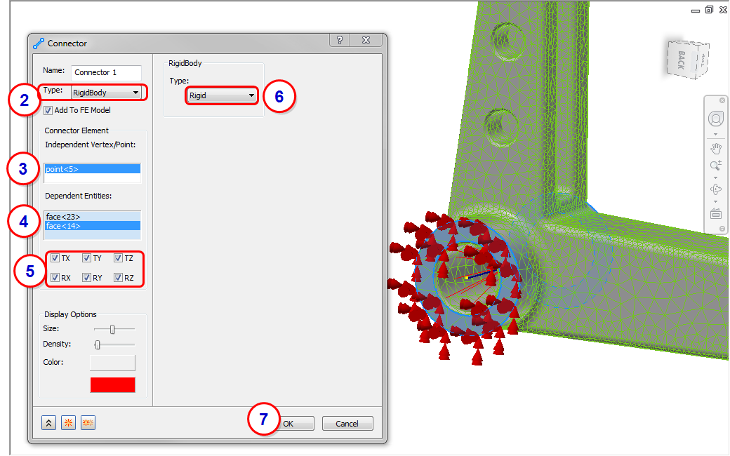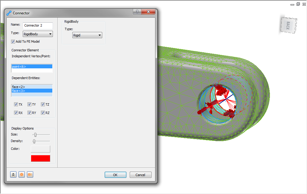 Repeat the procedure to create the ball joint constraint on the small hole. For the Independent Vertex, select the reference point on the axis. For the Dependent Entities, select the inner diameter surface from each hole, as shown: