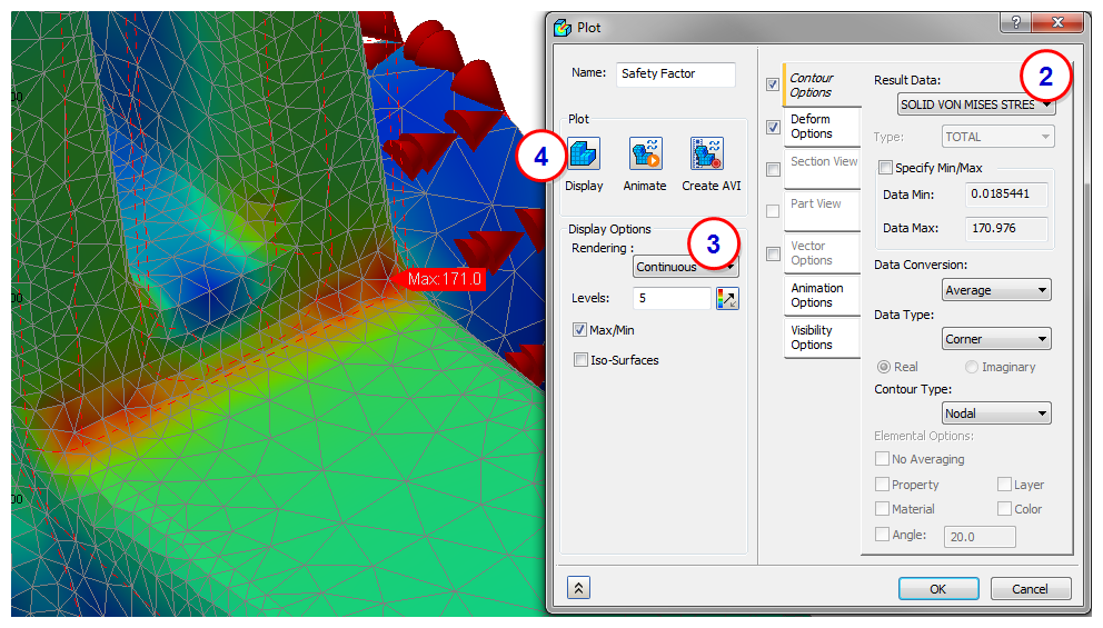 We'll start by displaying von Mises stress on the model and adjusting the rendering options: