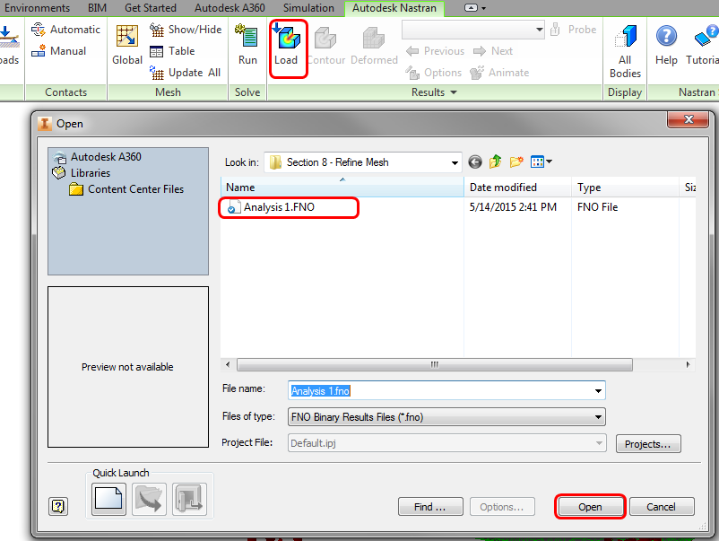 To load the results needed for this exercise, click Load from the Results panel, and select Analysis1.FNO: