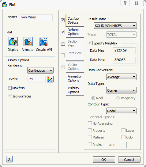 - Deselezionare la casella di controllo Max/Min nella sezione Opzioni di visualizzazione. Nella sezione Opzioni deformazione, selezionare Effettivo per visualizzare gli spostamenti effettivi. Impostare Dati risultato in Opzioni contorno su SOLID VON MISES STRESS. Selezionare Nascondi tutto nella sezione Opzioni visibilità e fare clic su Visualizza.