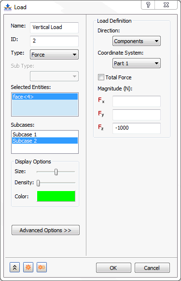 Cambiare il Nome in Vertical Load. Selezionare lo stesso foro che è stato utilizzato per il carico precedente e assicurarsi che l'opzione Subcase 2 sia selezionata nell'elenco Sottocasi. Nella sezione Definizione carico digitare -1000 nel campo FZ e fare clic su OK.