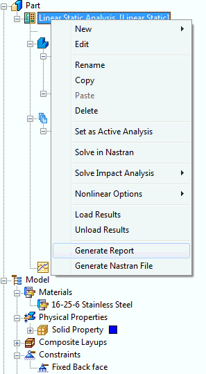 - Ancora una volta, nella vista struttura, fare clic con il pulsante destro del mouse su Linear Static Analysis e scegliere Genera rapporto.